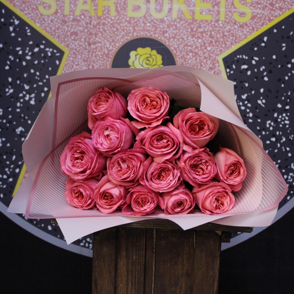 роза пионовидная пинк экспрешн – 15 шт.Пленка дизайнерская – 3 шт.Лента атласная – 2 шт.