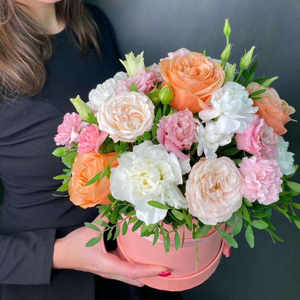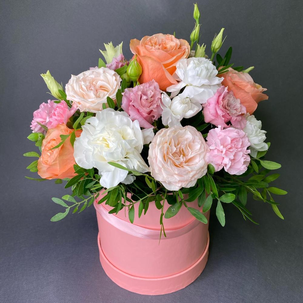 Роза Эквадор – 3 шт.Роза кустовая – 2 шт.Лизиантус – 2 шт.Диантус – 3 шт.Шляпная коробка – 1 шт.Оазис флористический – 1 шт.