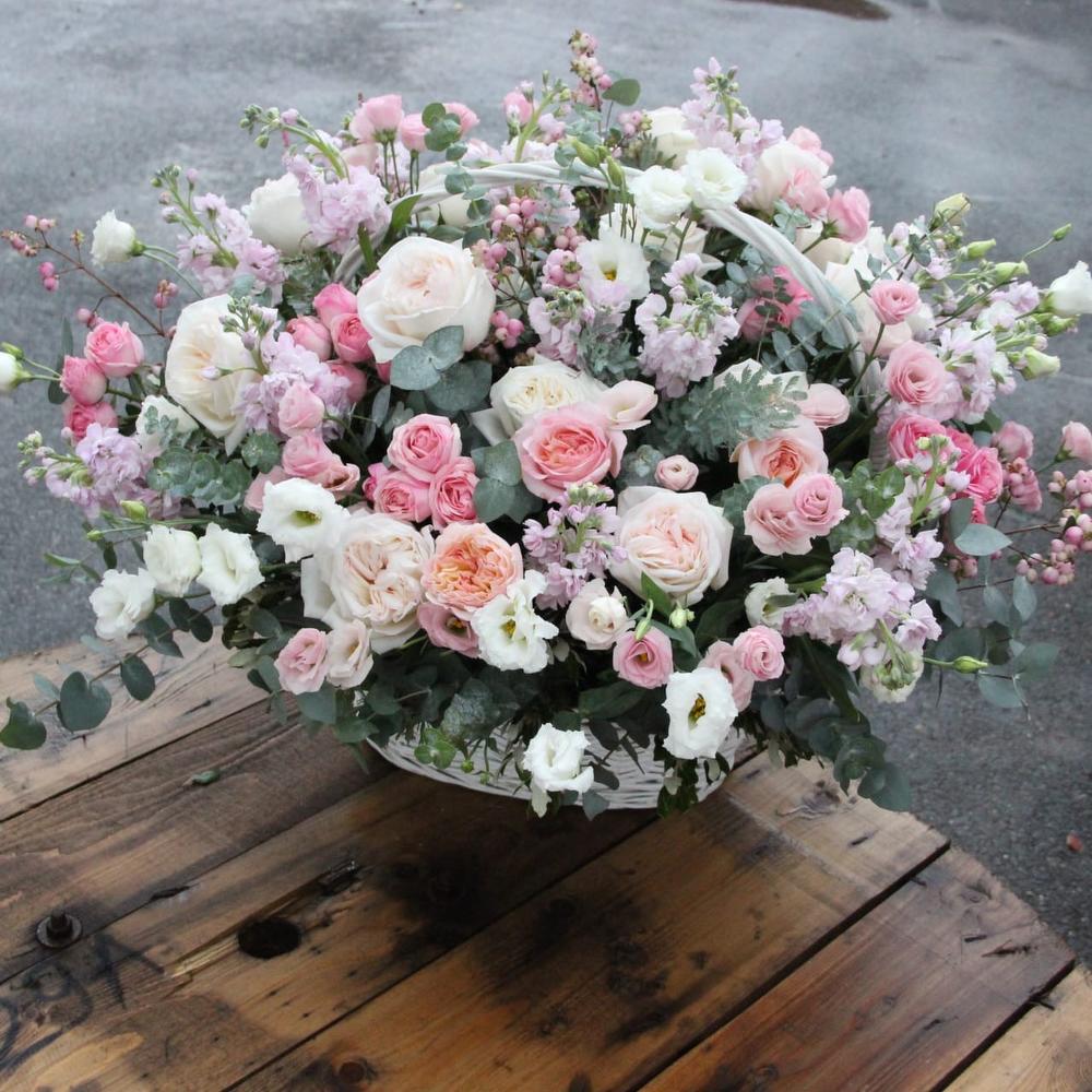 Корзина – 1 шт.Лизиантус – 25 шт.Маттиола – 20 шт.Эвкалипт – 11 шт.Оазис – 5 шт.Фисташка – 9 шт.Роза пионовидная – 35 шт.