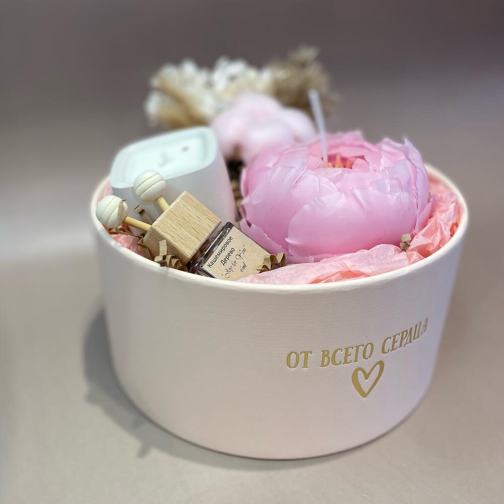 Хлопок – 1 шт.Тишью – 1 шт.Коробка – 1 шт.диффузор – 1 шт.гортензия стабилизированная – 1 шт.свеча в гипсовом стаканчике – 1 шт.свеча-пион – 1 шт.Лагурус – 3 шт.