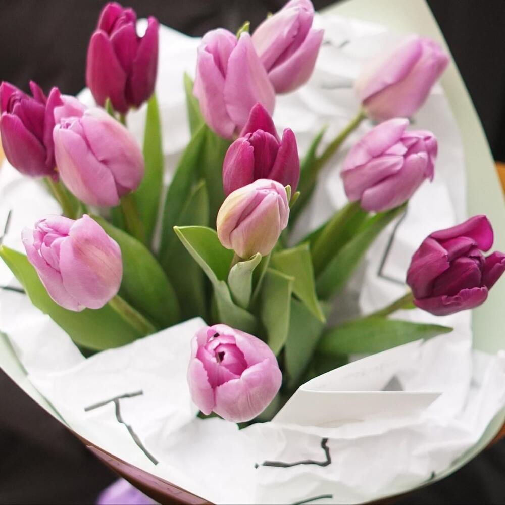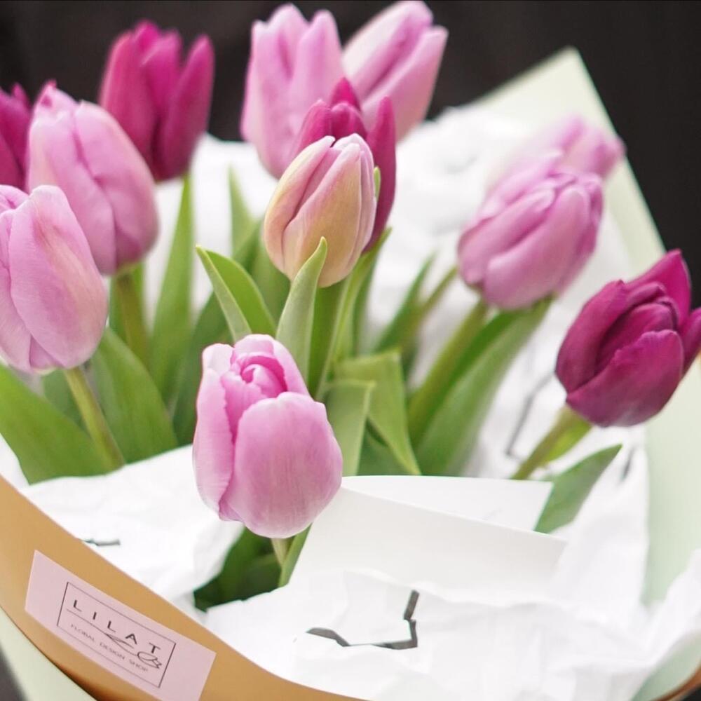Тюльпан – 13 шт. Дизайнерская упаковка – 13 шт. Открыточка с вашими пожеланиями – 1 шт. инструкция по уходу за цветами – 1 шт.