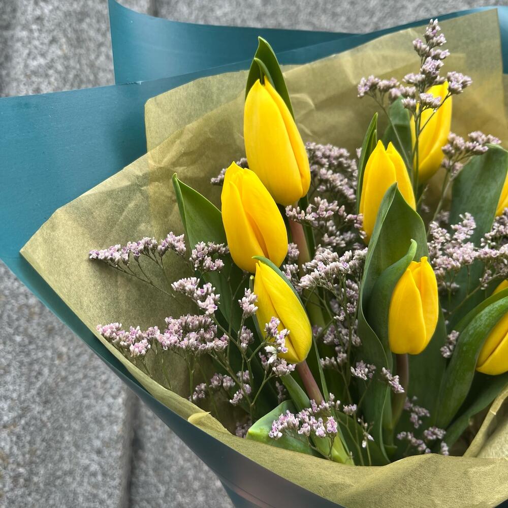 Тюльпан желтый – 9 шт.Лимониум – 1 шт.тишью золотое – 1 шт.Упаковка корейская пленка – 1 шт.Лента атласная – 1 шт.